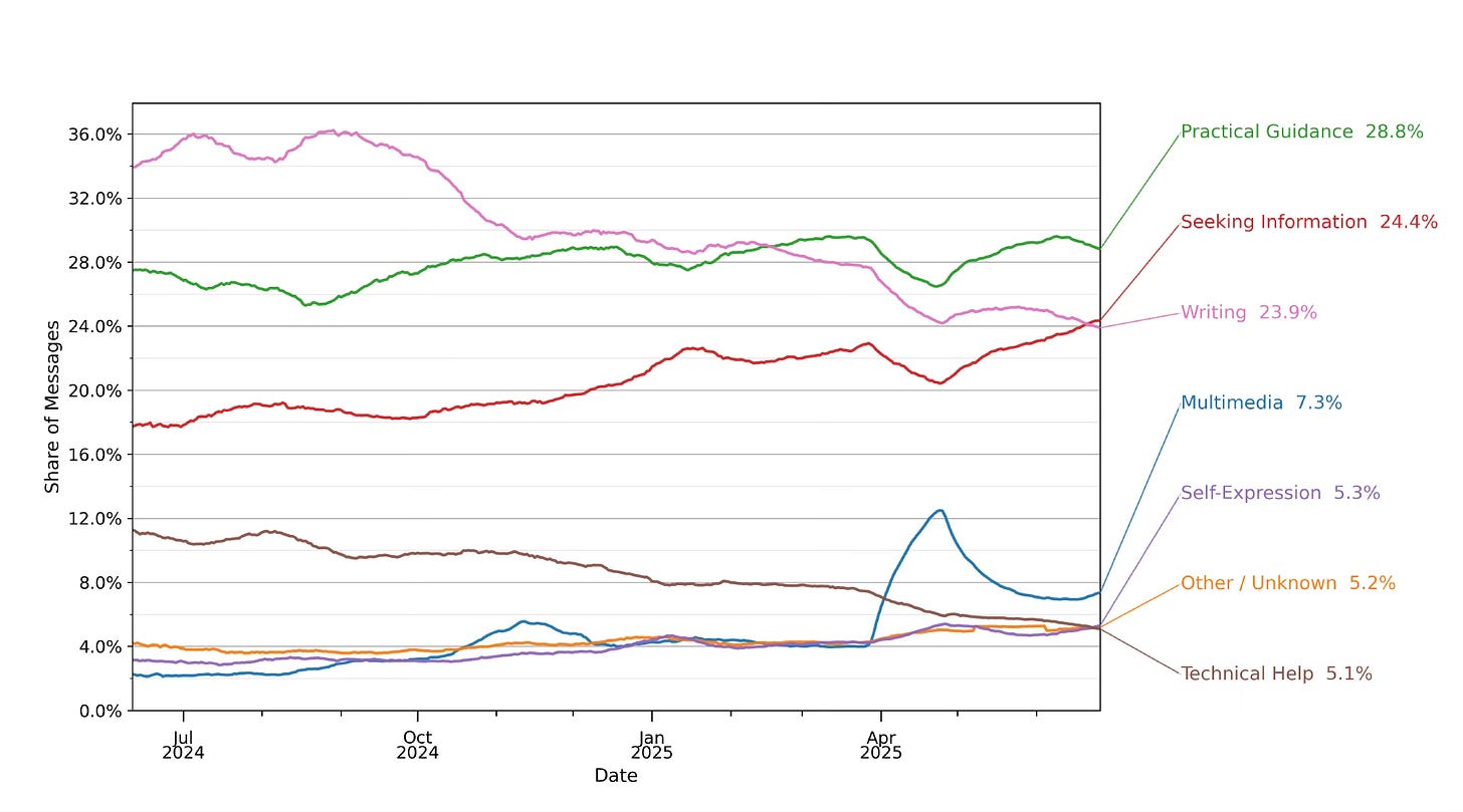 Another revealing category is self-expression. People send ChatGPT nearly 138 million messages daily (5.3% of the total) involving personal relationships, intimate reflections, small talk, or role play.
